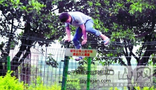 圖:一位正在翻越護(hù)欄網(wǎng)的市民